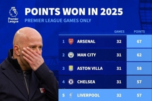 体育资讯11月25日讯 德国转会市场统计了2025年英超各队拿到的积分,并列出榜单,阿森纳67分居首,曼城62分次席,利物浦57分第五。